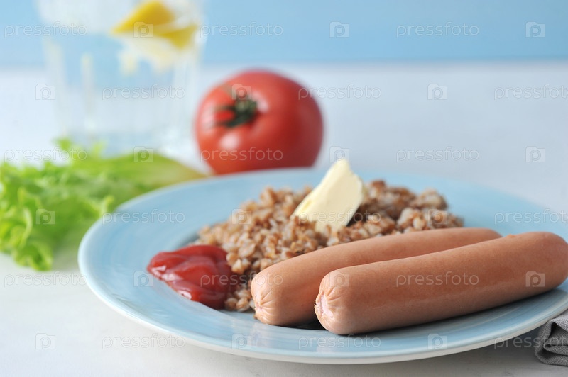 Гречка и сосиски с маслом и кетчупом