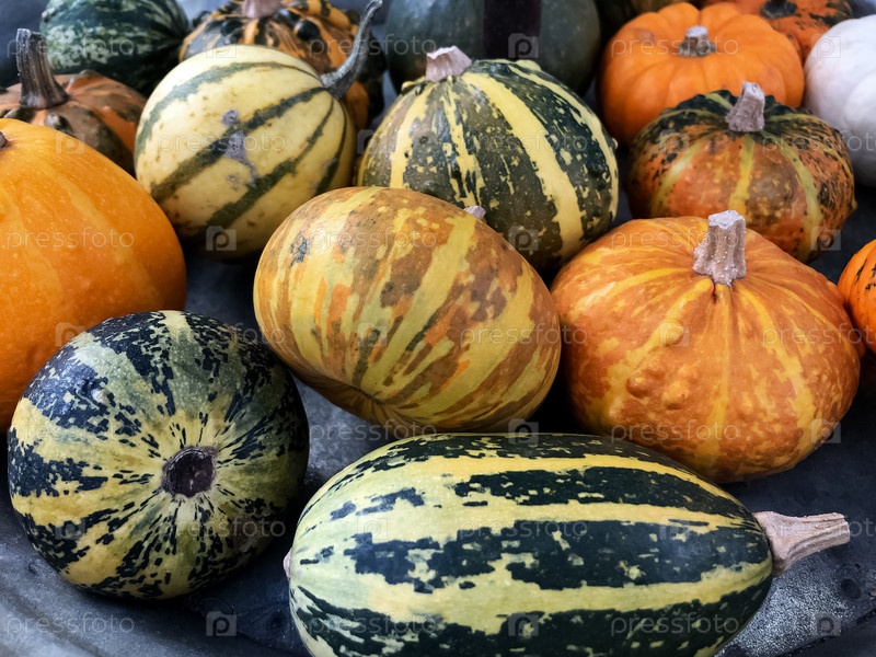Красочные сорта собранных тыкв и кабачков. День благодарения и Хэллоуин осенний декоративный фон