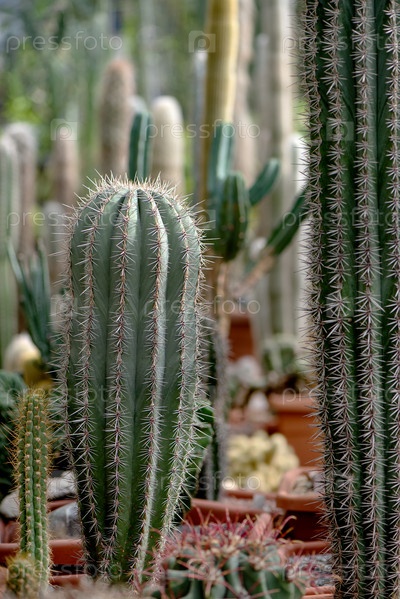 Разнообразие зеленых колючих кактусов фона. Домашние садовые растения