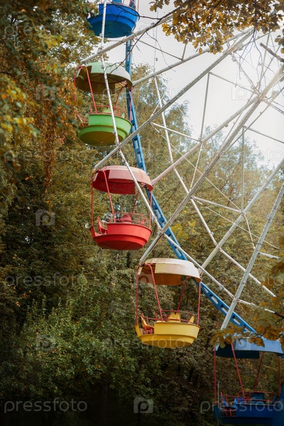 Пустые красочные кабины колес обозрения на фоне пожелтевших деревьев в осеннем парке развлечений
