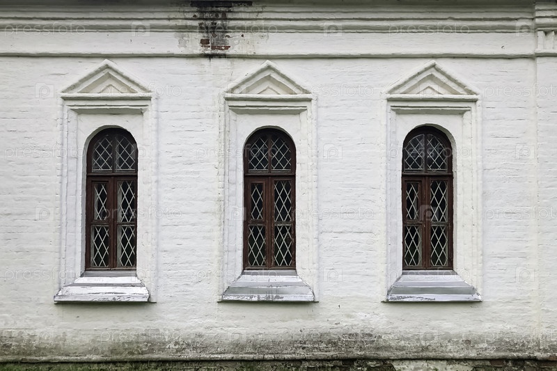 Группа из трех старомодных окон на фасаде старинного кирпичного дома