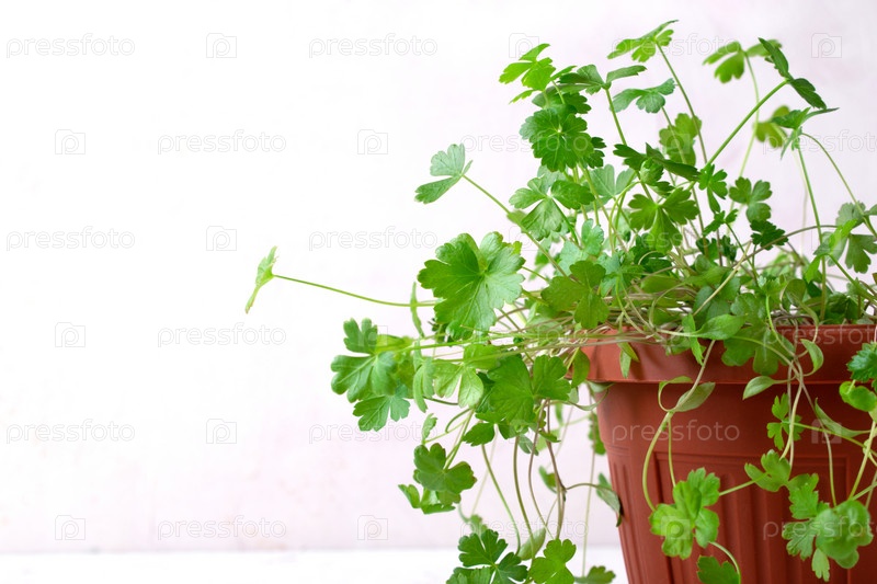 Молодая петрушка растет в горшке на белом фоне. Выращивание трав в домашних условиях