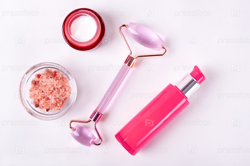 Набор для ухода за кожей с нефритовым валиком для массажа лица, розовым соляным скрабом, увлажняющим кремом и сывороткой для лица в бутылке с насосом на белом фоне. Плоская планировка косметических процедур