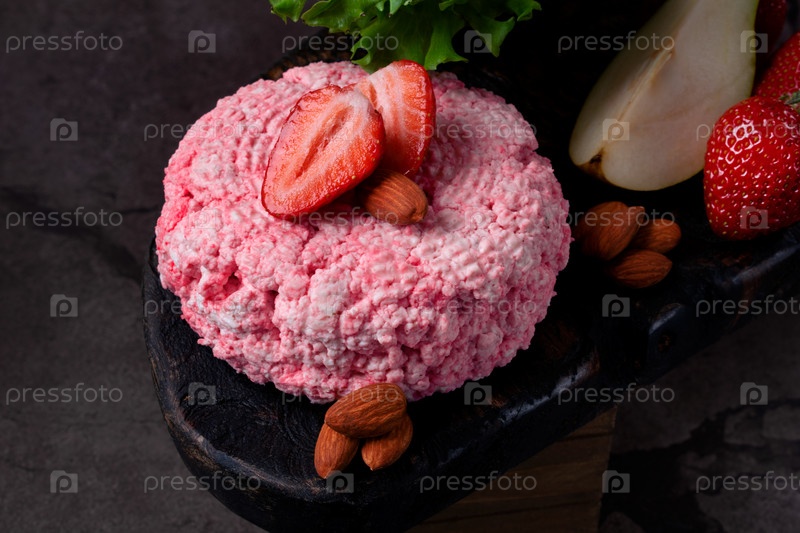 Сыр, пропитанный красным вином и ароматизированный, подается с клубникой и миндалем на деревянной доске
