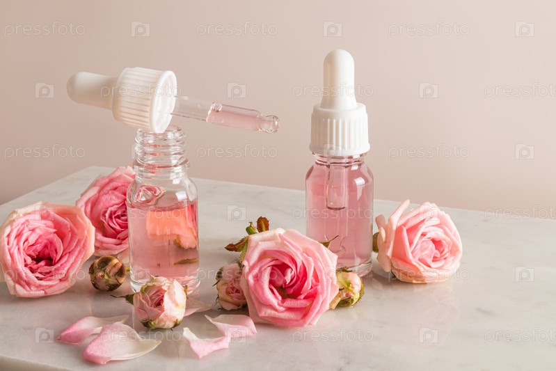 Открытая бутылка розового масла и пипетка, наполненная косметикой, на мраморном подиуме с цветами и лепестками роз. увлажнение, смягчение кожи