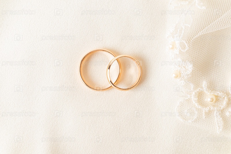 Вид сверху на два золотых обручальных кольца на атласном фоне цвета шампанского с кусочком кружевного тюля. Свадебный фон. Копия пространства