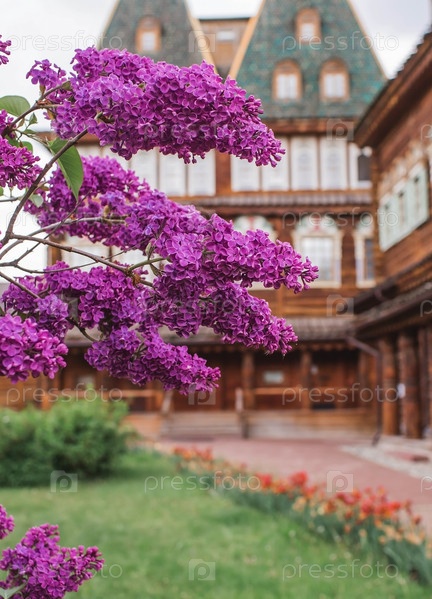 Красивая, пушистая сирень на фоне дворца царя Алексея Михайловича в Коломенском. Россия, Москва, май 2023 г