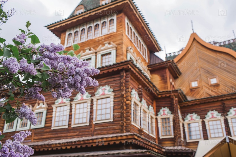 Красивая, пушистая сирень на фоне дворца царя Алексея Михайловича в Коломенском. Россия, Москва, май 2023 г