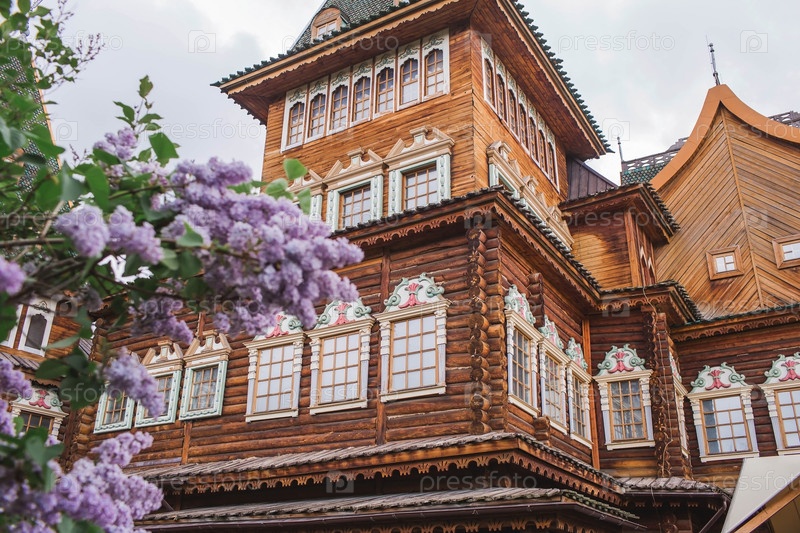 Красивая, пушистая сирень на фоне дворца царя Алексея Михайловича в Коломенском. Россия, Москва, май 2023 г
