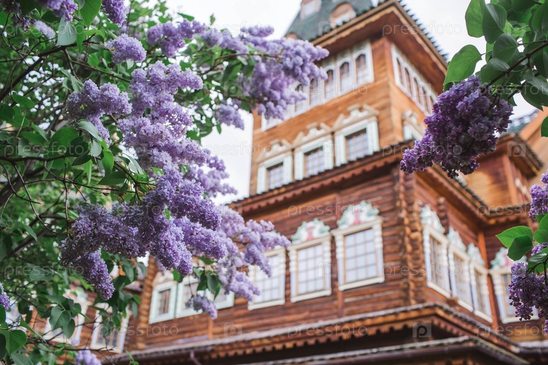 Красивая, пушистая сирень на фоне дворца царя Алексея Михайловича в Коломенском. Россия, Москва, май 2023 г