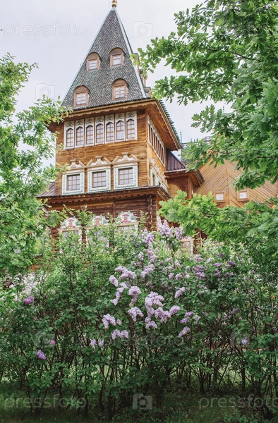 Красивая, пушистая сирень на фоне дворца царя Алексея Михайловича в Коломенском. Россия, Москва, май 2023 г