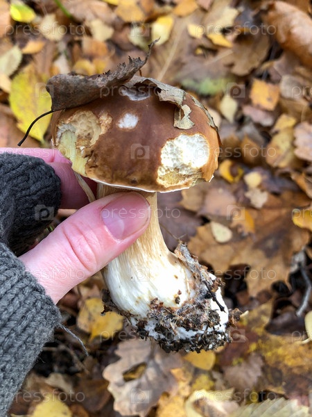 Boletus edulis или белый гриб в человеческой руке