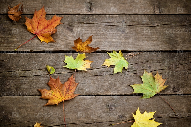 Красочные опавшие кленовые листья на осеннем фоне деревянных досок