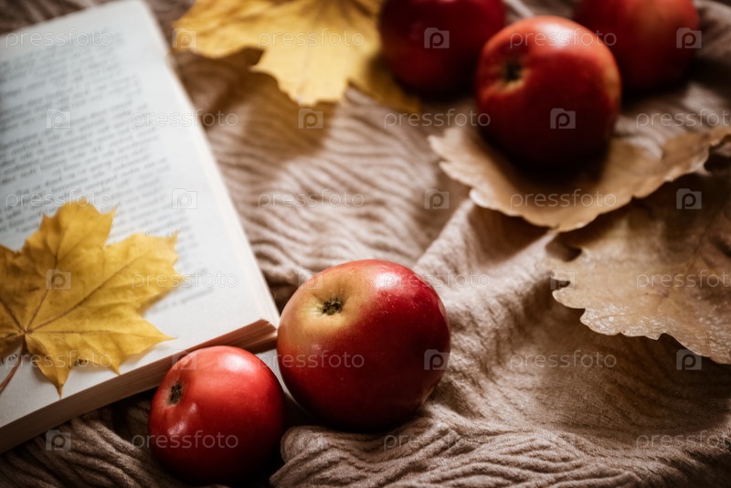 Спелые красные яблоки разбросаны по открытой книге с желтым кленовым листом в качестве закладки