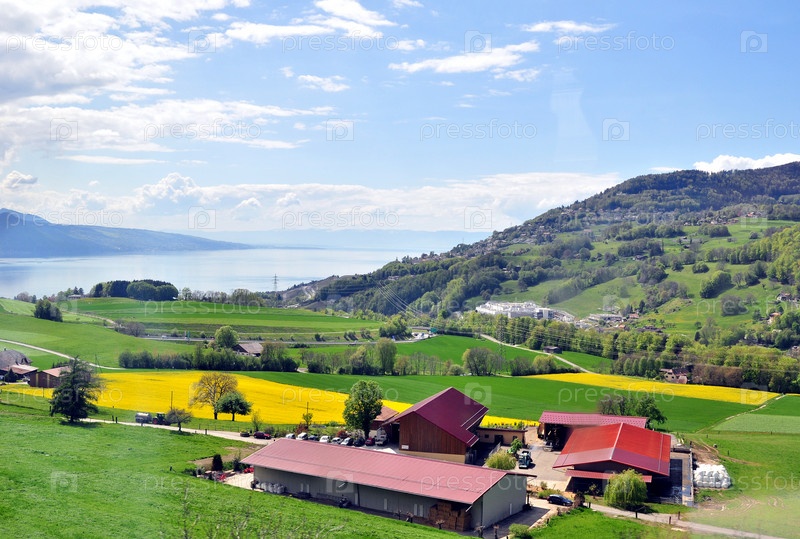 Сельхозугодья на берегу альпийского озера в окружении гор