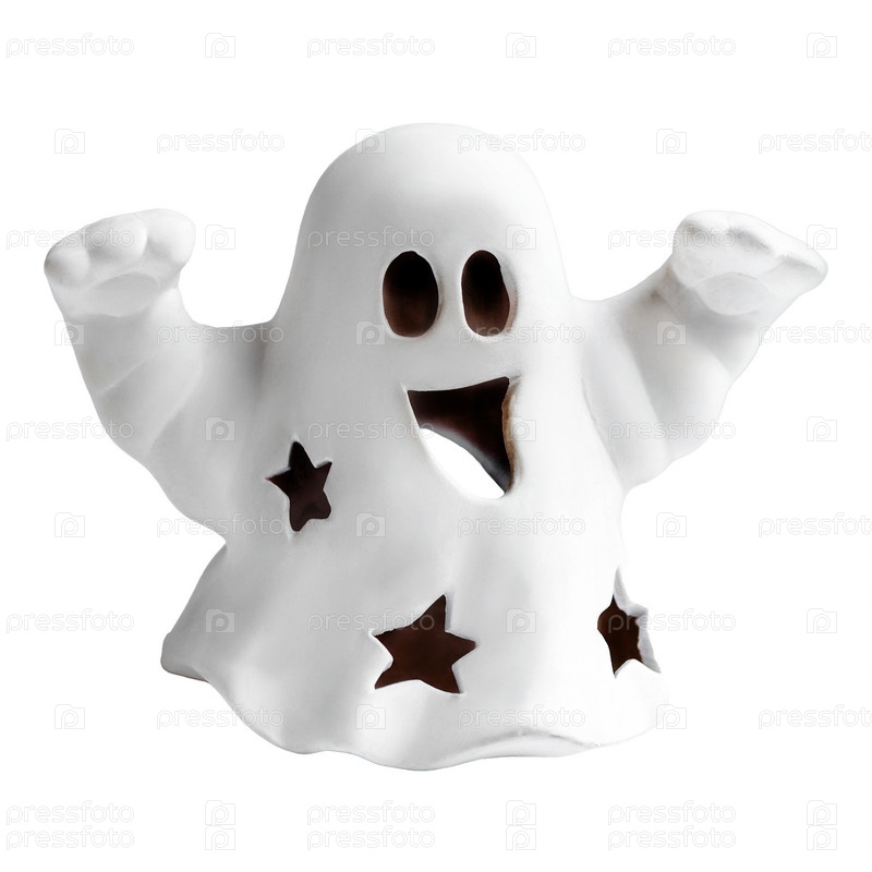 Забавный белый призрак делает бу-жест на белом фоне. Открытка на Хэллоуин
