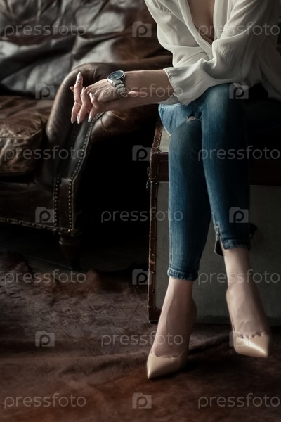 Элегантная женщина в тонких синих джинсах сидит со скрещенными ногами