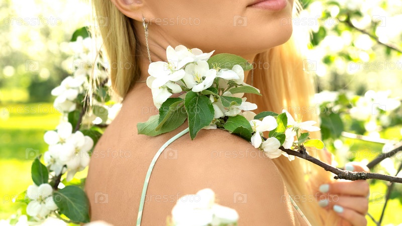 Цветущая ветка яблони лежит на плече обнаженной женщины в весеннем саду