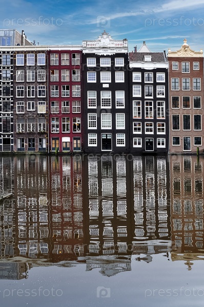Красочные фасады известных домов в Амстердаме, отражающиеся в канале реки Амстел