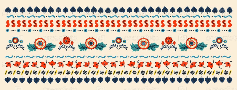 Набор этнических элементов. Бордюр представляет собой полосу с цветами, листьями, ветками, вензелями. Народная вышивка. Славянский, украинский, русский мотив. Хохлома, матрешка, дымковская игрушка. Мексиканский, индийский, цыганский ковер. Вязаное кружево