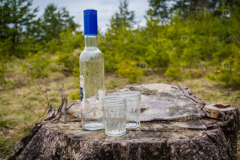 Стаканы и бутылка на пеньке