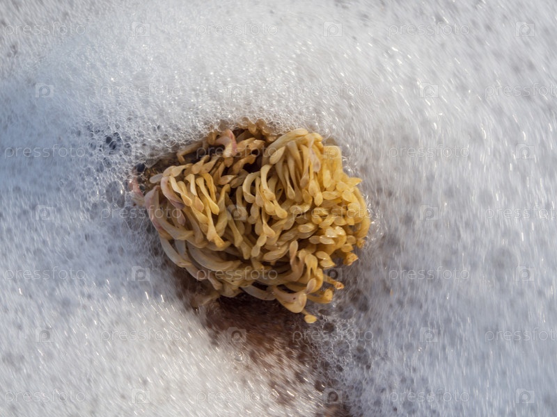 Личинки моллюска Rapana (ракушки) в пене Белого моря крупным планом. морская жизнь
