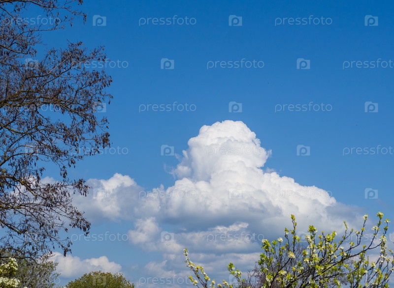 Огромное белое облако на голубом небе ранней весной в обрамлении цветущих и спящих деревьев. Красивое ясное лазурное небо с изящными облаками, вид через ветви деревьев весной