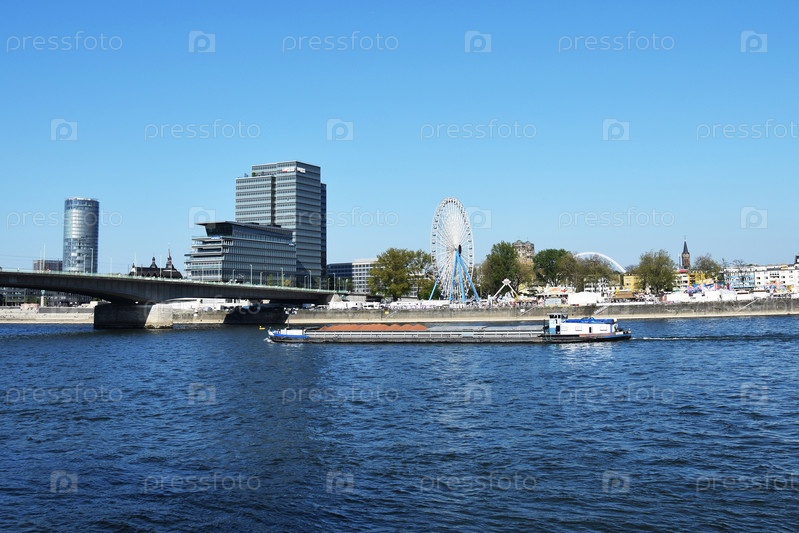 Река с проходящей баржей и берег с парком развлечений