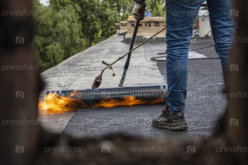Рабочий процесс ремонта крыши многоэтажного жилого дома. Монтажник с помощью газовой горелки и огня разогревает мягкий материал и укладывает его на поверхность крыши