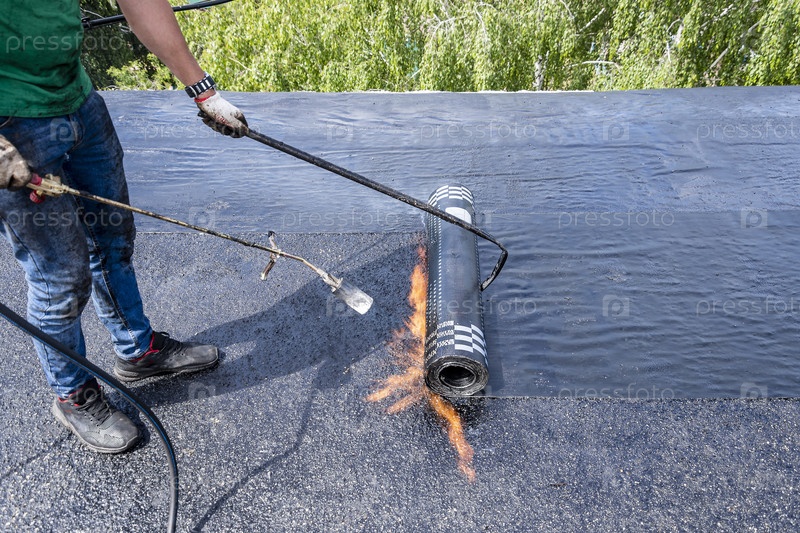 Рабочий процесс ремонта крыши многоэтажного жилого дома. Монтажник с помощью газовой горелки и огня разогревает мягкий материал и укладывает его на поверхность крыши