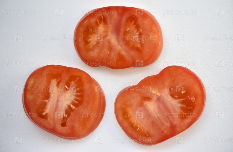 Кусочки красного помидора на белом фоне. Нарезанные помидоры