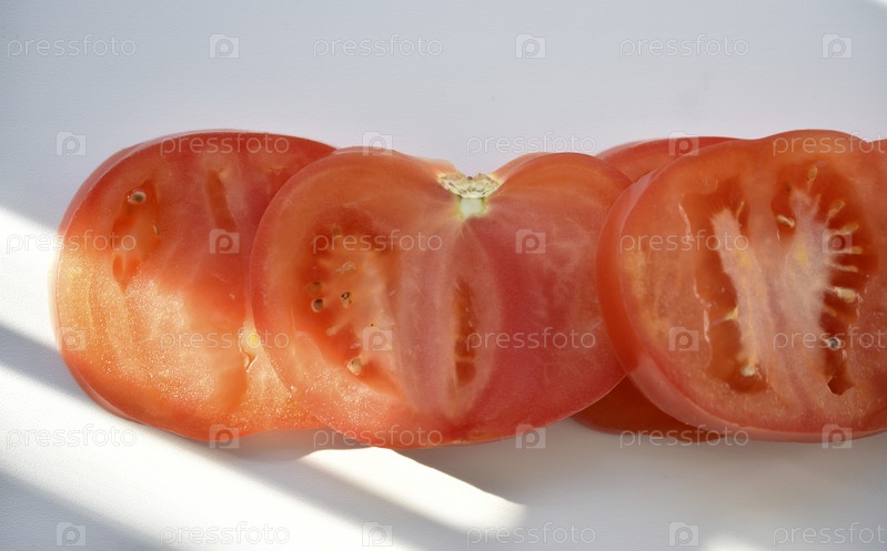 Кусочки красного помидора на белом фоне. Нарезанные помидоры