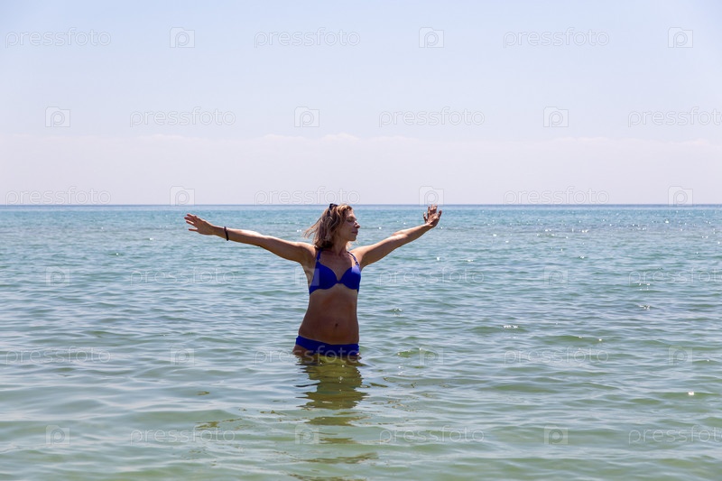 Красивая взрослая женщина в синем бикини развлекается на пляже. Счастливая улыбающаяся женщина позирует на песчаном пляже в воде. Счастливая европейка гуляет по пляжу с белым песком во время летних каникул с копировальным пространством