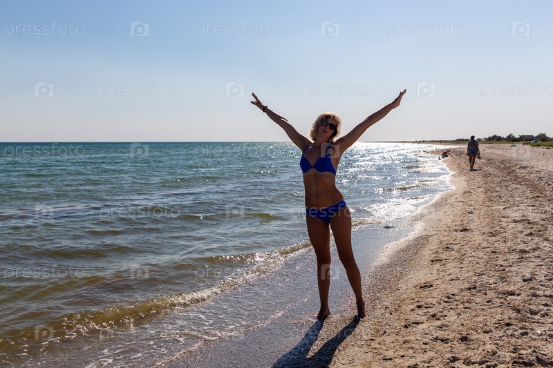 Красивая взрослая женщина в синем бикини развлекается на пляже. Счастливая улыбающаяся женщина позирует на песчаном пляже в воде. Счастливая европейка гуляет по пляжу с белым песком во время летних каникул с копировальным пространством