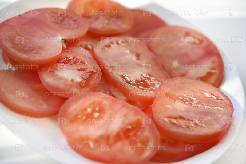 Нарезанный помидор на белой тарелке. Салат из помидоров. Нарезанные овощи. Красные помидоры