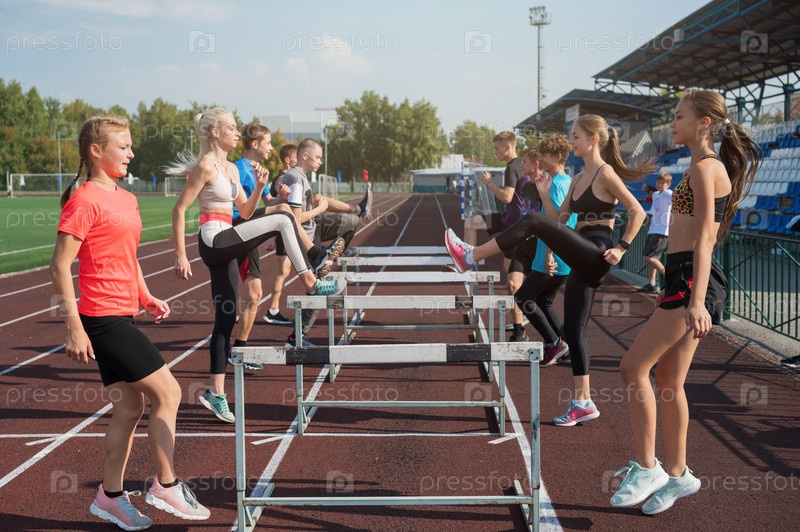 Молодые спортсмены-бегуны тренируются с препятствиями на стадионе на открытом воздухе