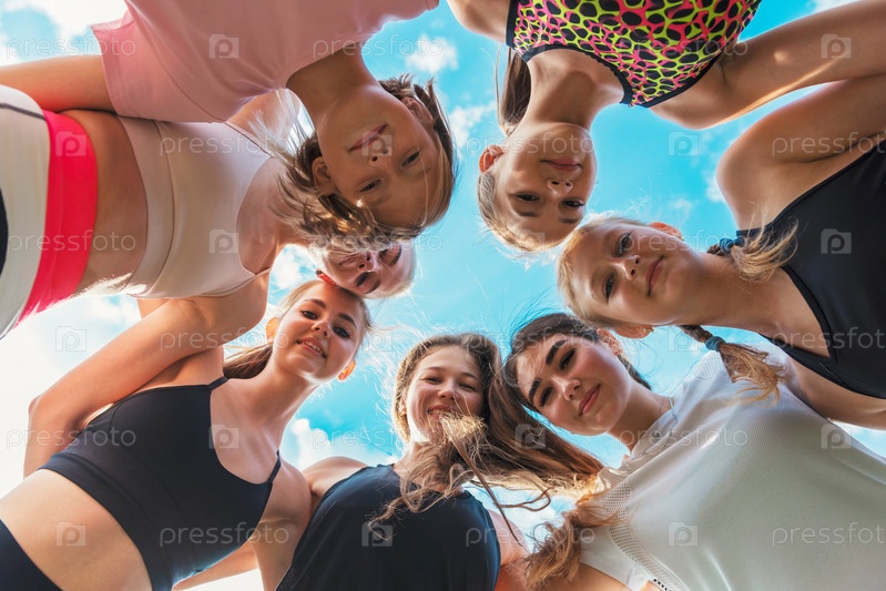 Группа детей и молодых девушек с тренером-женщиной в кругу дружбы