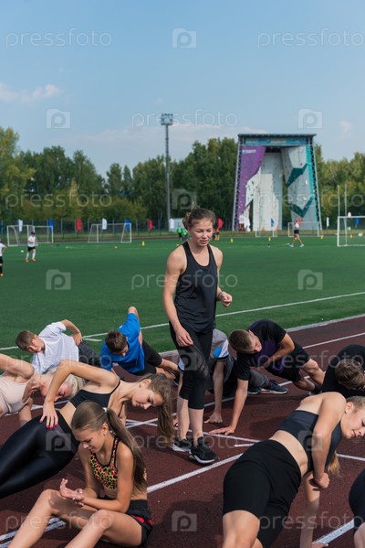 Женский тренер и группа детей проводят тренировку на стадионе. Тренировки в школьном спортзале или легкая атлетика