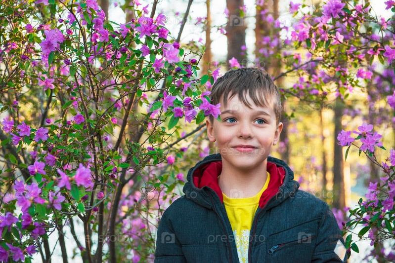 Счастливый ребенок, путешествующий по горам Алтая весной на красивом быстро развивающемся розовом фоне цветов рододендрона