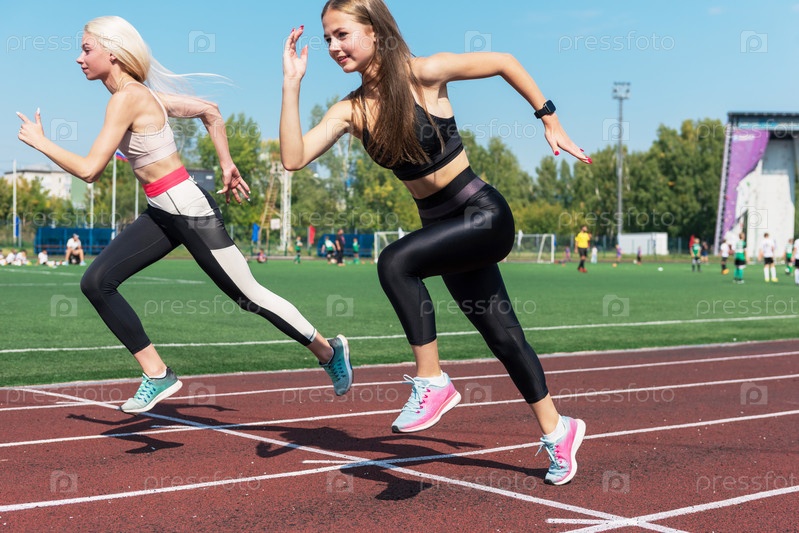 Две спортсменки, молодые женщины, бегуны на старте на стадионе на открытом воздухе