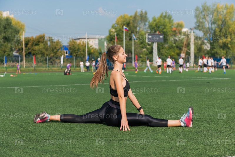 Молодая спортсменка тренируется на стадионе на открытом воздухе