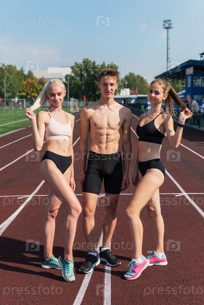 Группа спортсменов, молодых женщин и мужчин-бегунов на стадионе на открытом воздухе
