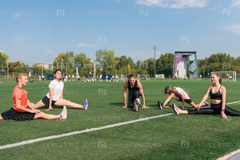 Женский тренер и группа детей проводят тренировку на стадионе на открытом воздухе