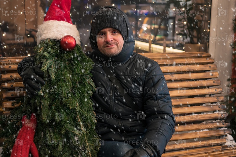 Мужчина с манекеном, украшенным елкой. Рождественские праздники, Новый год или Рождество концепции