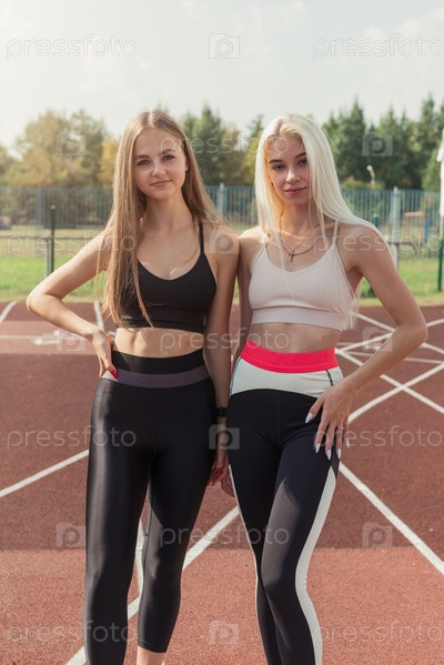 Две спортсменки, молодые женщины-бегуны на стадионе на открытом воздухе
