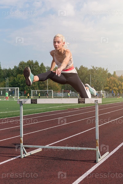 Молодая женщина-спортсменка бегает с препятствиями на стадионе на открытом воздухе