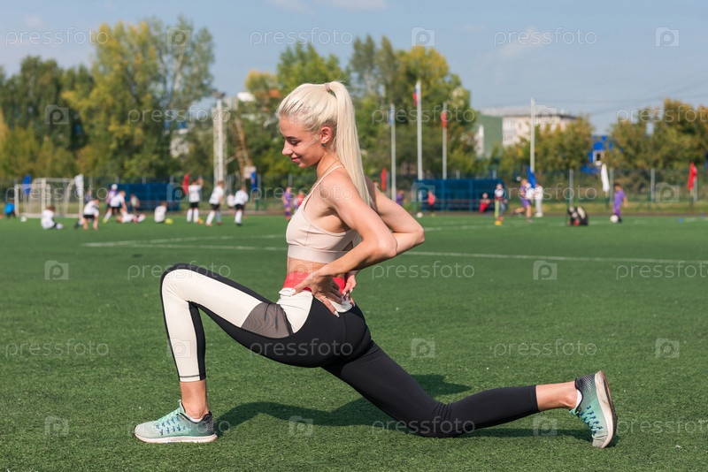 Молодая спортивная женщина в спортивной одежде растягивается на стадионе