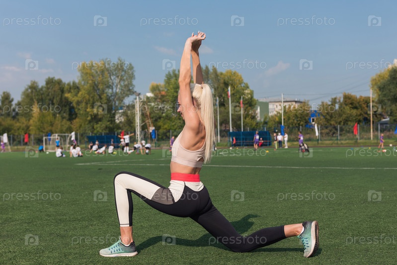 Молодая спортивная женщина в спортивной одежде растягивается на стадионе