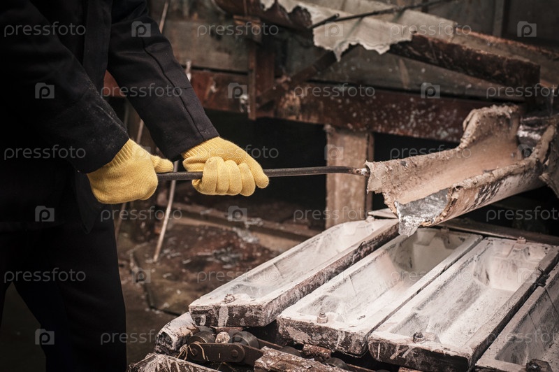 Литейщик заливает жидкий металл в формы