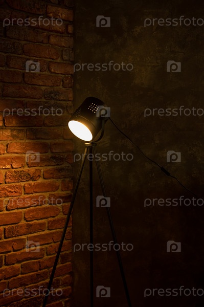 Винтажная деревенская лампа закреплена на штативе на фоне кирпичной стены